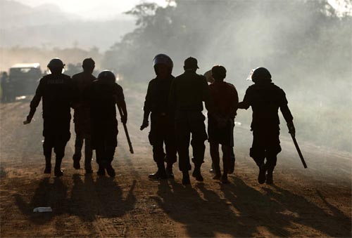 پليس ها يك معترض به ساخت بزرگراه را درحومه Yucumo بوليوي در 25 سپتامبر 2011 دستگيركرده اند .