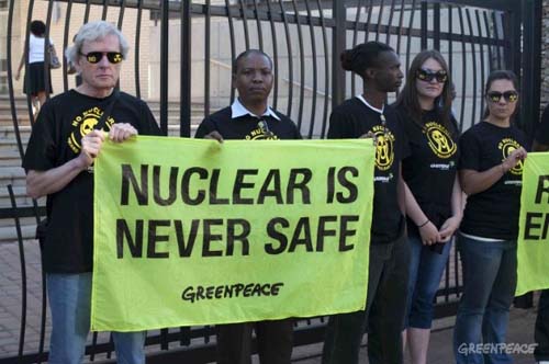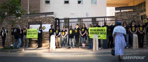 فعالين گرين پيس با پوشيدن تي شرتي كه روي آن نوشته شده بود phansi nuclear ، براي اعتراض به انرژي هسته اي در مقابل سازمان انرژي "پرتوريا " تجمع كرده تا به دولت يادآوري كنند كه نياز به استفاده از انرژي پاك بجاي انرژي هسته اي دارند.