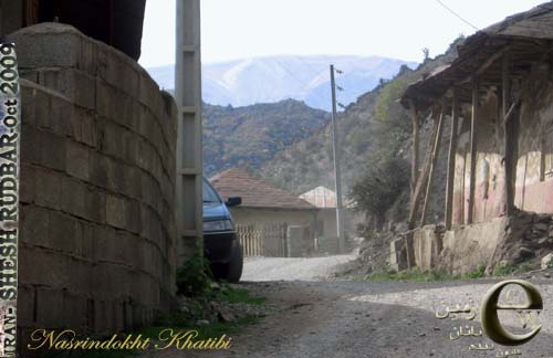 تصویری از سامون( مرز منطقه به زبان بومی ) شش رودبار و فیروز کوه ( کوهی با رنگ روشن ) و همچنین یک ساختمان قدیمی در شش رودبار