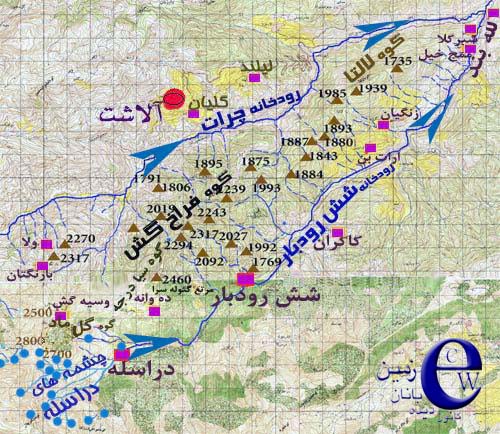 موقعیت منطقه حفاظت شده شش رودبار در نقشه1:50000 ( پدیده های طبیعی و اسامی نقشه توسط کانون دیده بانان زمین بزرگ نمایی شده است )