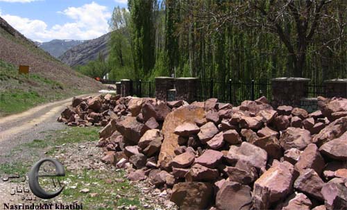 سنگ هاي دپو شده در کنار ويلا براي احداث بهمن گير در دامنه کوه